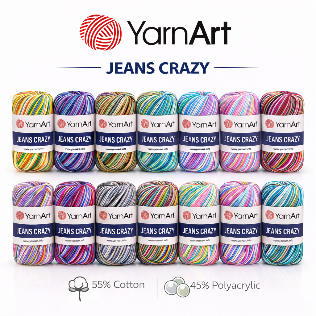 YarnArt Jeans Crazy, popüler Jeans serisinin ebruli (renk geçişli) versiyonu olup, %55 pamuk ve %45 poliakrilik içeriğiyle yumuşak, tüylenmeyen ve dayanıklı bir yapıya sahiptir. 50 gram ağırlığında ve 160 metre uzunluğunda olan bu iplik, amigurumi, hırka, kazak, atkı ve bere gibi projeler için 3.5 mm şiş veya tığ ile kullanıma uygun ideal bir ince (fine) ipliktir.